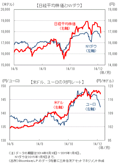 ■年明けの主要国の株式市場は、軟調な展開となっています。NYダウの1月5日終値は、前年末比▲321.42米ドルの17,501.65米ドルと、昨年12月中旬の水準に下落しています。1月6日の日経平均株価は、前日比▲525.52円、前年末比▲567.58円の16,883.19円と、こちらも昨年12月中旬以来の水準に下落しました。