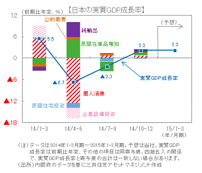 ■2014年10-12月期の実質GDP成長率は前期比年率+2.2%と消費税増税の影響が薄れ、3四半期ぶりにプラス成長となりました。輸出が円安効果などもあり同+11.4%(寄与度は1.9%)と大きく伸びたことが寄与しました。