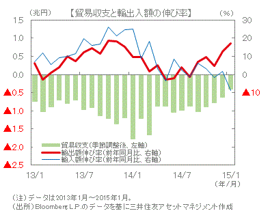 ■1月の貿易収支は▲4,061億円(季節調整後)と赤字幅が縮小しました。円安などにより輸出が大きく増加する一方、原油安などにより輸入が大きく減少したことが背景です。輸出では自動車や半導体等電子部品が好調でした。