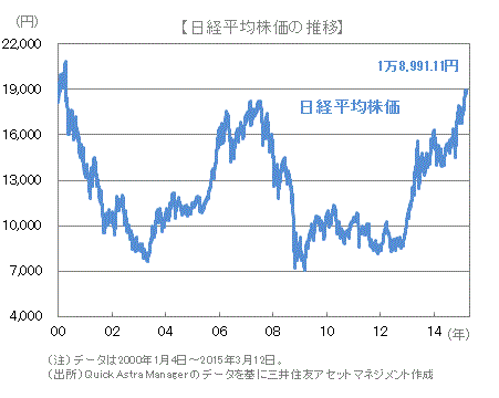■日経平均株価は、3月12日の日中に1万9,008円13銭と、2000年4月19日(終値)以来、実に約15年ぶりに1万9,000円台を回復しました。