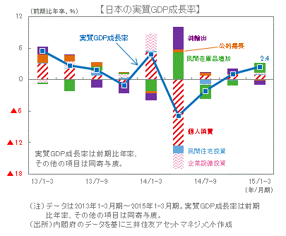 ■内閣府は20日、1-3月期のGDP統計1次速報値を発表しました。実質GDP成長率は、前期比年率+2.4%と伸びが加速しました。消費税増税の影響を脱し、住宅投資や設備投資が4四半期ぶりにプラスとなり、個人消費は緩やかながら3四半期連続のプラスでした。2014年度の実質GDP成長率は前年度比▲1.0%と、消費税増税の影響から2009年度以来のマイナス成長となりました。