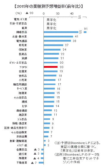 ■2015年通年では、全体で20%増益となる見込みです。4-6月期の業績が全体として上振れたものの、多くの企業が2015年度の計画を据え置いています。ギリシャ情勢や中国の景気減速懸念などの不透明要因を背景に、慎重な計画となっており、状況が改善すれば上方修正が期待されます。また、企業が想定する米ドル円レートは115円程度が中心と見られ、現在の為替水準が続けば、為替の面からも収益の上方修正が見込まれます。