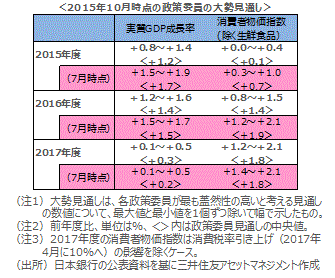 ■同日に発表の「経済・物価情勢の展望」(展望レポート)では2015年度の実質GDP成長率と消費者物価上昇率がともに大幅に下方修正されました。