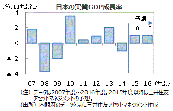 ■2015年度の実質GDP成長率は+1.0%(前年度比)とプラスに転換する見通しです。四半期では、15年4-6月期に中国向け輸出や個人消費が低迷したことで、前期比年率で▲0.5%とマイナス成長となりました。7-9月期は堅調な設備投資によって2四半期連続のマイナス成長は避けられ、緩やかな景気回復を維持する見通しです。