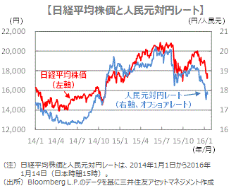 ■中国の景気減速懸念が再燃したきっかけは、年明けに発表された企業景況感の下振れです。これを受け、中国株式市場が急落、新たに導入されたサーキットブレーカー制度が発動(その後制度停止)されるなど混乱が続きました。また、通貨当局が人民元の対米ドル基準レートの低下を容認し実質的な切り下げを行っているとの見方も景気への懸念を助長しました。その後人民元は落ち着いた推移となっています。