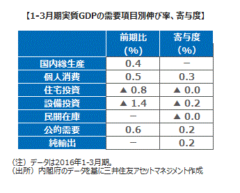 ■内閣府が18日発表した2016年1-3月期の実質GDP成長率(一次速報)は、前期比+0.4%、同年率+1.7%と2四半期ぶりのプラス成長となりました。市場コンセンサス(前期比年率+0.3%、ブルームバーグ集計)を大きく上回りました。しかしながら、うるう年の影響を考慮すれば実態は強くないとみられます。2015年4‐6月期以降、全体として景気の足踏み状態が続いています。