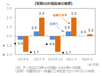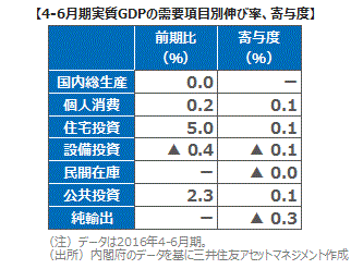 ■4-6月期はマイナス金利政策の影響から住宅投資が前期比+5.0%と前期(同▲0.1%)から大きく増加したことや、個人消費が同+0.2%(同+0.7%)と2四半期連続のプラスとなったことが全体を下支えしました。また、2015年度補正予算の進捗により公共投資も同+2.3%と高めの伸びとなりました。