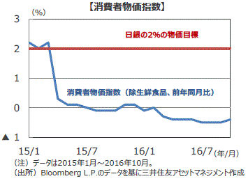 ■日銀は、2%の物価目標を掲げていますが、予想物価上昇率は弱含みの局面が続いていると判断しています。日銀は、物価は当面小幅のマイナスないし0%程度で推移する一方、需給バランスの改善から、中長期的な予想物価上昇率の高まりによって、2%に向けて上昇していくと見ています。