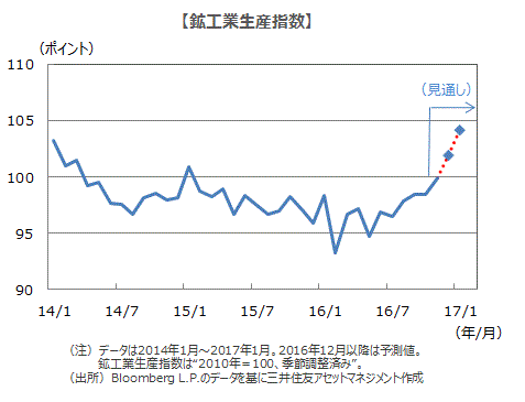 ■年末から年明けにかけて公表された経済指標は、概ね10-12月期の景気回復の継続を確認する結果となりました。景気は16年7-9月期に持ち直しに転じており、海外景気の回復や政府の経済対策による下支えから、振れを伴いつつも回復傾向が続くと見られます。物価については、潜在成長力を上回る景気回復となることから、17年後半にかけて消費者物価コア指数は前年比1%程度まで伸び率が高まっていくと見られます。