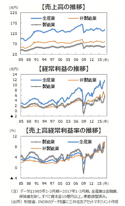 ■財務省は1日、2017年1-3月期の「法人企業統計」を発表しました。全産業(金融業、保険業を除く、資本金10億円以上、以下同様)の売上高は、季節調整済み前期比で+3.5%と2四半期連続の増収でした。業種別に見ると、製造業が前期比+2.7%、非製造業が同+3.9%と、ともに増収となりました。製造業は円安と景気の回復を背景に数量が拡大したことが、非製造業は内需が持ち直したことがそれぞれ売上の増加に繋がったと見られます。