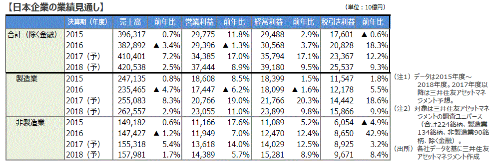 ■2017年度の企業業績は、売上高410兆円(前年度比+7.2%)、経常利益35.8兆円(同+17.1%)と予想します。当社で集計する対象企業の52.7%が過去最高経常利益を更新する見通しで、増益基調が一段と強まる見通しです。製造業、非製造業ともに2桁の増益が見込まれ、電力・ガスを除く29セクターで増益を予想します(12月以降の前提は、110円/米ドルレート、130円/ユーロ。原油価格は60米ドル/バレル)。