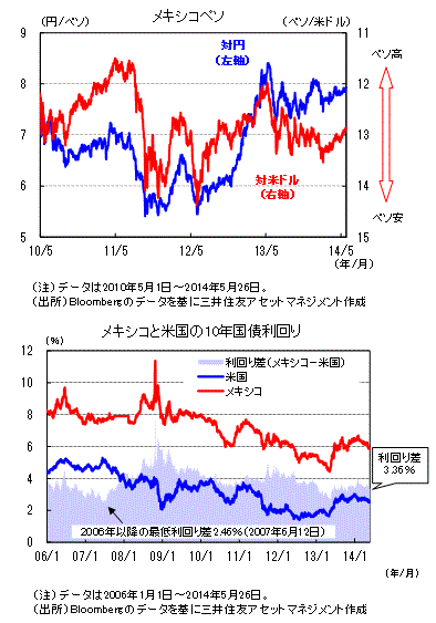 中銀は、5月21日に公表した「インフレ・レポート」で実質GDP成長率の予想を2014年は前年比+2.3%~3.3%(従来は同+3.0%~4.0%)、2015年は同+3.2%~4.2%(変更なし)としました。史上最低水準の政策金利、政府の積極的な財政政策、米国景気の持ち直しなどが下支えとなり、メキシコの経済成長率は緩やかに上昇すると見込まれます。