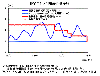 一方、消費者物価指数は5月前半に前年同月比+3.44%と今年1月(同+4.48%)を直近のピークに低下し、中銀のインフレターゲットの年+3%(変動幅±1%)に近づきつつあります。景気の回復が緩やかにとどまっていることなどから、中銀は2015年1-3月期にはインフレがターゲット近辺に落ち着くと見ています。