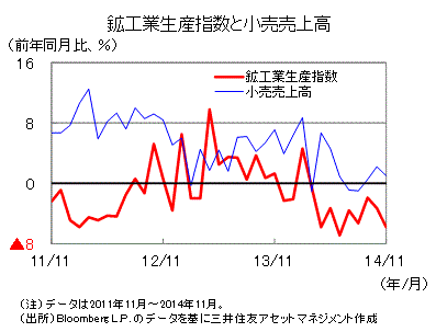 ■2014年11月の鉱工業生産指数は前年同月比▲5.8%と、同年3月以降9カ月連続のマイナスになりました。また、12月の輸出は同▲16.1%と、8月以降5カ月連続のマイナスになりました。利上げや、海外景気の減速による輸出の不振などから、生産は当面低迷が続くと思われます。