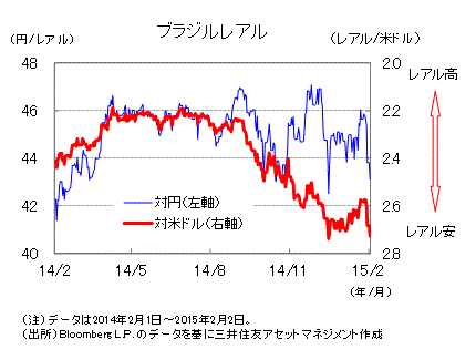 ■ブラジルレアルは、足元で下落傾向にあり、2月2日時点で1月26日に対して対円で▲6.0%、対米ドルで同▲5.6%となりました。