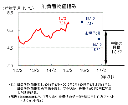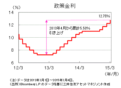 ■2015年2月前半の消費者物価指数は、前年同月比+7.36%と、1月の同+7.14%から上昇し、中銀の物価目標(年+2.5%~+6.5%)の上限を大きく上回る状況が続いています。背景には、干ばつの影響による食品の値上がりや、電力など公共料金の引き上げなどがあります。
