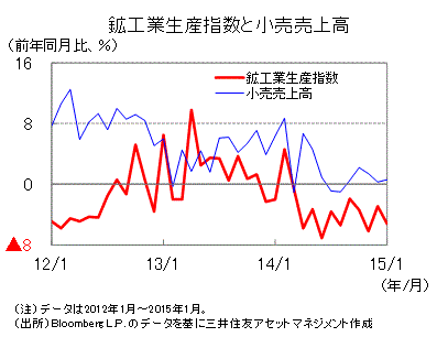 ■1月の鉱工業生産指数は前年同月比▲5.2%と、2014年3月以降11カ月連続のマイナスになりました。また、同月の小売売上高は同+0.6%と伸び悩みました。利上げや外需の弱さが影響し、生産、消費ともに低迷しています。
