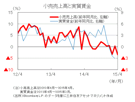 ■4月の小売売上高は前年同月比▲3.5%と、前月の同+0.3%からマイナスに転じました。物価高などにより実質賃金の伸びが今年に入りマイナスになっていることが要因の一つと思われます。