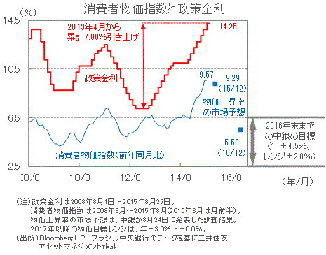 ■中銀は、政策金利を当面据え置くことで物価が落ち着くと見ています。一方、中銀が毎週発表する市場の物価予想(2016年末)は8月に入り3週連続で上昇しています。中国の株価下落や景気不安などによるリスク回避の動きから新興国通貨の下落が進んでおり、レアル安が物価を押し上げるとの見方が根強いためと思われます。