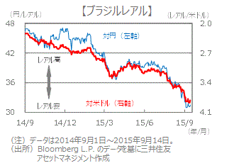 ■ブラジルレアルは、9月に入り財政不安や格下げから下落傾向を強め、対円では一時1レアル=30円台と、2002年9月以来のレアル安水準をつけました。9月14日時点では同31.5円と、昨年末から▲30%の下落率になっています。