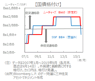 ■政府財政に対する不安の背景は、景気低迷の中で財政再建が進まないことです。8月末に政府が議会に提出した予算案によると、2016年の財政収支(利払いを除く)は、3年連続の赤字とされました。これを受け、大手格付け会社S&Pはブラジル国債の格付けをBB+に引き下げ、非投資適格級としました。