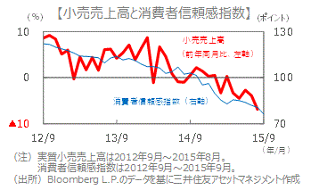 ■8月の小売売上高は、物価の影響を除いた実質で前年同月比▲6.9%と、マイナス幅の拡大が続きました。消費者信頼感指数は9月も低下しており、物価高や金融引き締めが消費者心理に影響していると見られます。