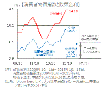 ■ブラジル中央銀行(以下、中銀)は、9月2日の前回会合で政策金利を14.25%に据え置きました。中銀は、現行の金融政策を長期にわたり維持することにより、物価を2016年末に目標(年+4.5%)に落ち着かせる方針ですが、足元まで物価は高止まりしています。