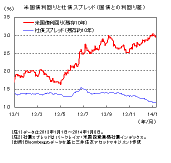 米国債市場では、昨年11月に経済指標の改善を受け利回りが上昇し、12月に入ってからも雇用統計の改善などで上昇が続きました。12月18日にはFRBがQE3の縮小を発表し、米国債利回りは一段と上昇しました。12月下旬には、米国の10年国債利回りは3%を上回る水準まで上昇しました。