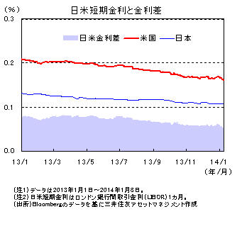 米国では雇用の持ち直しから個人消費が改善し、景気は底堅い回復が続くと思われます。景気見通しの改善からFRBはQE3の縮小を決定しましたが、1月8日公表の議事録ではQE3の継続が金融の安定へのリスクとなる面を懸念していることが示されており、QE3縮小は今後も続くと見込まれます。ただし、失業率がまだ高いことなどから、QE3の縮小は経済指標の改善を確認しつつ行われ、低金利政策は当面継続されると思われます。