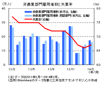 2月の失業率は6.7%と、1月の6.6%から小幅に上昇しました。ただし、職探しをする人が増加し新たに失業者に加わったことが要因であり、今後は雇用者の増加が続くことで失業率の低下基調が再現すると見込まれます。
