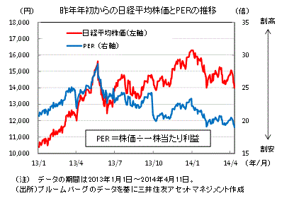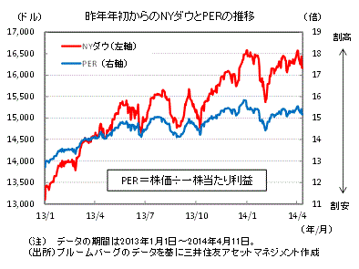 一方、米国では2014年も潜在成長率を上回る2%台後半、2015年は3%台の良好な経済成長が見込まれ、雇用情勢や住宅市場の改善などは続く見込みです。また、FRB幹部らも4月に入ってからは利上げを急ぐ姿勢を見せておらず、高めの成長と低金利という、企業にとって良好な環境が今後もしばらく続く見込みです。こうしたなか、企業業績の回復への確信度が高まれば、株価は次第に緩やかな上昇基調に戻っていくものと見られます。