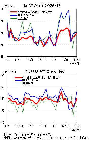 4月のISM製造業景況感指数は前月比+1.2ポイントの54.9ポイントと上昇しました。寒波の影響により、1月は同▲5.2ポイントと大幅に落ち込みましたが、2月から4月にかけて計3.6ポイント上昇しました。また、4月のISM非製造業景況感指数は同+2.1ポイントの55.2ポイントと、2カ月連続の上昇となりました。製造業指数、非製造業指数ともに市場予想(ブルームバーグ集計)を上回る好調な結果となりました。