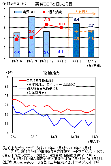 2014年1-3月期の実質GDP成長率は、年末年始の寒波の影響などを考慮した事前の市場予想をさらに下回る大幅な低下となりました。しかし、4月以降の経済指標をみると、非農業部門雇用者数は過去分の上方修正も見られ、失業率の安定的な低下に必要と考えられる前月比+15万人~20万人を上回るペースでの上昇が続いています。このほか、景況感も年初来で一時的な低下は見られていたものの、中立水準の50ポイントを割ることなく足元では上昇してきており、先行きについても新規受注指数などからみて堅調と考えられます。一方、物価は足元で上昇率が緩やかに加速しているものの、FRBの長期目標とする水準を下回っており、FRBが指摘する雇用の質(時間当たり賃金の上昇や長期失業者数の割合など)の改善とともに、FRBが低金利政策を維持する要因となっています。今秋にも終了すると見込まれるQE縮小後の利上げのタイミングについては、雇用や物価の回復度合いなどから2015年後半以降と見る向きが大勢となっています。