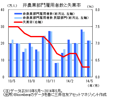 民間部門を業種別に見ると、建設業や小売業では増加ペースがやや鈍化したものの、製造業や教育・医療、レジャー・娯楽業では一段と雇用者が増加しました。また、労働時間は3カ月連続で同水準となり、高止まりしています。一方、イエレンFRB議長が労働市場のスラック(たるみ)として指摘している平均賃金については、3カ月ぶりの伸びとなりました。同様に、高水準が指摘される長期失業者の割合は5月に34.6%と35%を割り込んだほか、パート労働者の割合も18.7%と着実に低下しています。