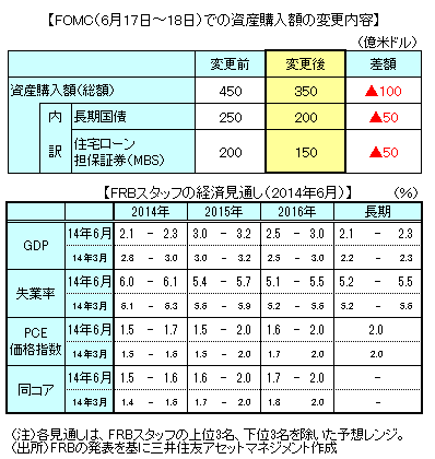 今回のFOMCで更改された3カ月に一度の経済見通しでは、年末年始の寒波を受けた1-3月期のGDP成長率が前期比年率▲1.0%(暫定値)とマイナスに転じたことなどを受け、2014年のGDP見通しが引き下げられました。一方、2015年、2016年は据え置かれています。また、足元の雇用者数の増加や失業率の低下を受けて、失業率の見通しが全期間にわたり小幅に引き下げられました。インフレの見通しについては、ほぼ据え置かれました。