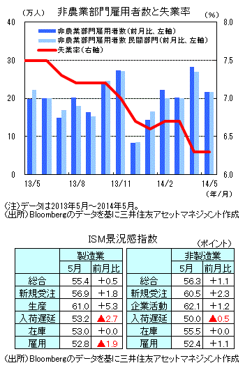 ・5月のISM景況感指数は製造業、非製造業ともに新規受注指数が上昇し、当面堅調さが続くことを示しました。