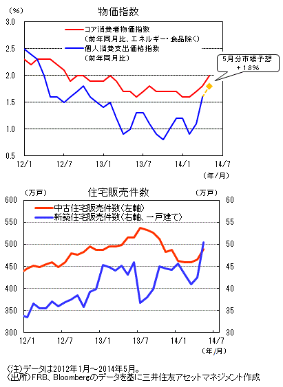 4月のS&P/ケース・シラー住宅価格指数(20都市平均)は前月比+0.2%と、住宅価格の上昇は一段と緩慢になっています。しかし、販売件数や在庫などからみて、住宅市場は年末年始の寒波の影響による減少が底入れし、持ち直しつつあると考えられます。今後は低金利が続くと見込まれることや雇用環境の改善とともに、緩やかに回復すると見込まれます。