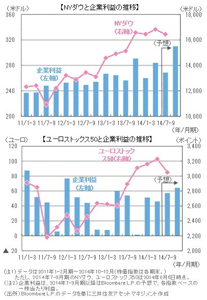 ■米国では、2014年4-6月期の実質GDP成長率が前期比年率+4.0%と市場予想を上回ったほか、7月のISM景況感指数は、製造業・非製造業ともに前月を上回り高水準を維持しています。また、NYダウ採用銘柄の4-6月期の業績は、前年同期比+7%程度の増益となりそうです。
