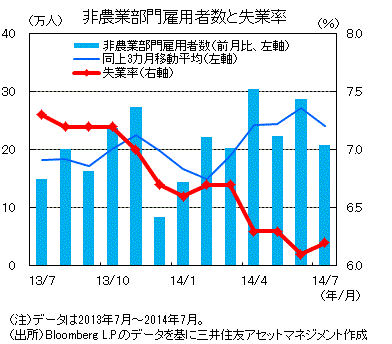 ■7月の非農業部門雇用者数は前月比+20.9万人と、6カ月連続で20万人超の増加となりました。また、失業率は同+0.1ポイントの6.2%となりました。失業率の上昇は、新たに職探しを始めた人が労働市場に参入したことが主因と考えられ、雇用環境が総じて改善基調にあることに変化はないと思われます。