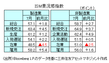 ■7月のISM景況感指数は、製造業が前月比+1.8ポイント、非製造業が同+2.7ポイントと一層改善が進みました。新規受注指数も、ともに前月比でプラスとなり、先行きの堅調さを示しています。