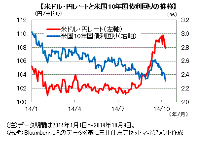 ■米国の10年国債利回りは9月中から再び低下し、9日には2.313%と今年の最低水準を更新しました。また米ドル・円レートは、9日には107円台半ばと今月初めの110円台から円高となっています。
