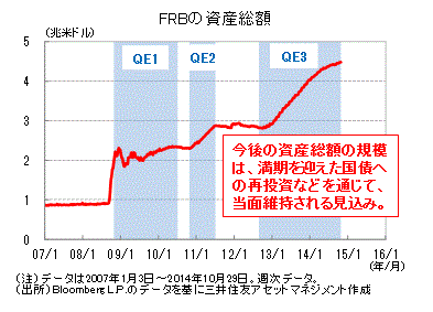 ■FRBは10月28日~29日のFOMCで、量的金融緩和策(QE)の終了を決定しました。今年1月以降縮小してきた資産購入額がいよいよゼロになります(10月までの月額は150億米ドル)。