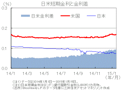■短期金利の動きをロンドン銀行間取引金利(LIBOR)でみると、米国では2015年半ば以降の利上げ開始観測が高まり短期金利が上昇した一方、日本では日銀の金融緩和が継続し金利の低下が進み、日米金利差は若干拡大しました。