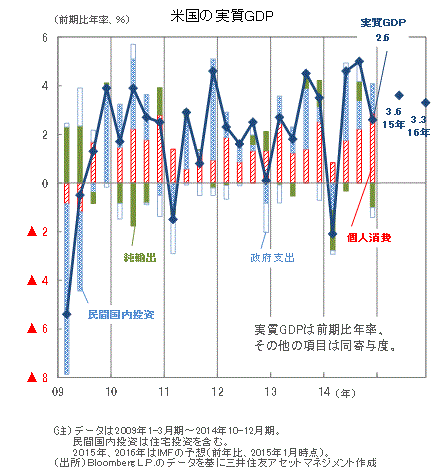 ■今回の結果で米国経済の先行きを過度に悲観する必要はないと考えられます。原油安は石油関連企業の投資抑制要因となっている可能性はありますが、ガソリン価格の値下がりは家計の恩恵です。2015年の米国経済は個人消費がけん引役となり、潜在成長率(2.0~2.5%程度)を上回るペースでの成長が続くと見られます。