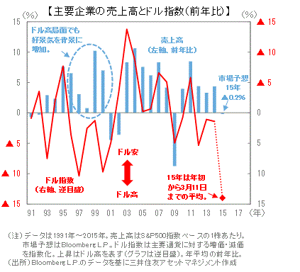 ■ただし、米国が好景気だった90年代後半には、ドル高でも売上高の伸び率がプラスを維持する局面が見られました。今回のドル高局面でも米国の景気の堅調さが企業収益をけん引する展開が期待されます。