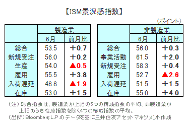 ■6月のISM製造業景況感指数は、総合指数が53.5ポイントとなり、前月の52.8ポイントから0.7ポイントの上昇となりました。総合指数を構成する5指標のうち、新規受注、雇用、在庫の3指標が前月から上昇し、生産、入荷遅延の2指標が低下しました。