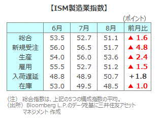 ■8月のISM製造業景況感指数は、総合指数が51.1ポイントとなり、前月の52.7ポイントから1.6ポイントの低下となりました。