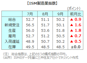 ■9月のISM製造業景況感指数は、総合指数が50.2ポイントとなりました。前月の51.1ポイントから低下しましたが、好不況の分岐点となる50の水準は維持しました。