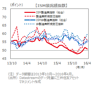 ■2016年4月のISM製造業景況感指数は、総合指数が50.8ポイントとなりました。前月の51.8からは低下したものの、好不況の分岐点となる50ポイントは上回りました。