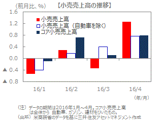 ■同月の小売売上高は前月比+1.3%増、自動車を除いても同+0.8%増でした。天候要因などによって低調だった1月~3月から、急回復しました。